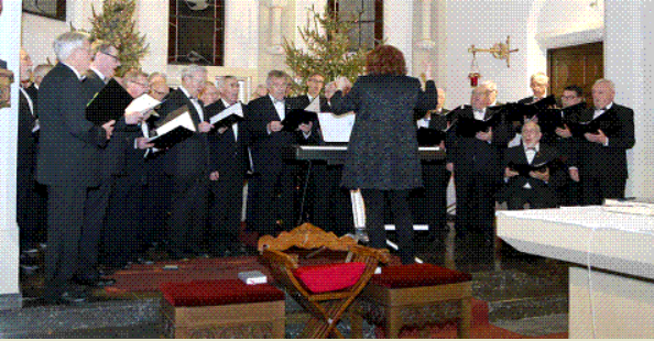 Schon während der vorausgehenden heiligen Messe hatte der Chor seine Sangeskraft unter Beweis gestellt, zum Einzug mit „Lasst uns lauschen“ in der Bearbeitung von W. Geyr, dann mit dem Gloria Deo von Mary Lynn Lightfoot und „Es blüht eine Rose zur Weihnachtszeit“ von Robert Stolz (Satz Reinhard Grieshaber). Nach der Kommunion überzeugte Arnold Schmitz einmal mehr als Solist im Lied Jerusalem (The Holy City) von Stephan Adams. Abschluss des Messgesangs war das Lied „Stille Nacht“ von Franz Gruber. Die gleich anschließende Matinee bereicherte Regionalvikar Markus Bruns mit zwei Texten. Im ersten ging es um das Licht, auch um das künstliche Licht, das die Werbung versprüht und von dem sich die Menschen verführen lassen. „Weihnachten ist an keinen Tag und an keinen Ort gebunden“, erklärte er in seinem zweiten Text und gab der Hoffnung Ausdruck, „dass auch unsere Herzen eine Krippe sein mögen, in der die Liebe geboren wird.“ Der Chor sang zur Matinee „Es ist ein Ros entsprungen“ von Michael Praetorius, im Terzett „Es wir schon gleich dunkel“ von Anton Reidinger und „Das Licht aus dunkler Nacht“ von Pietro A. Yon in der Bearbeitung von Bernd Stallmann. Beim französischen Weihnachtslied „Minuit, Chrétiens“ von Adolphe Adam waren erneut Arnold Schmitz und Ralf Wellens die Solisten. Zu Ende ging die Matinee mit „O du gnadenreiche Zeit“ von Hermann Ophoven und einem nicht enden wollenden Beifall des Publikums in der Kirche. Von Anna Petra Thomas, Heinsberger Zeitung, 02.01.2020 |