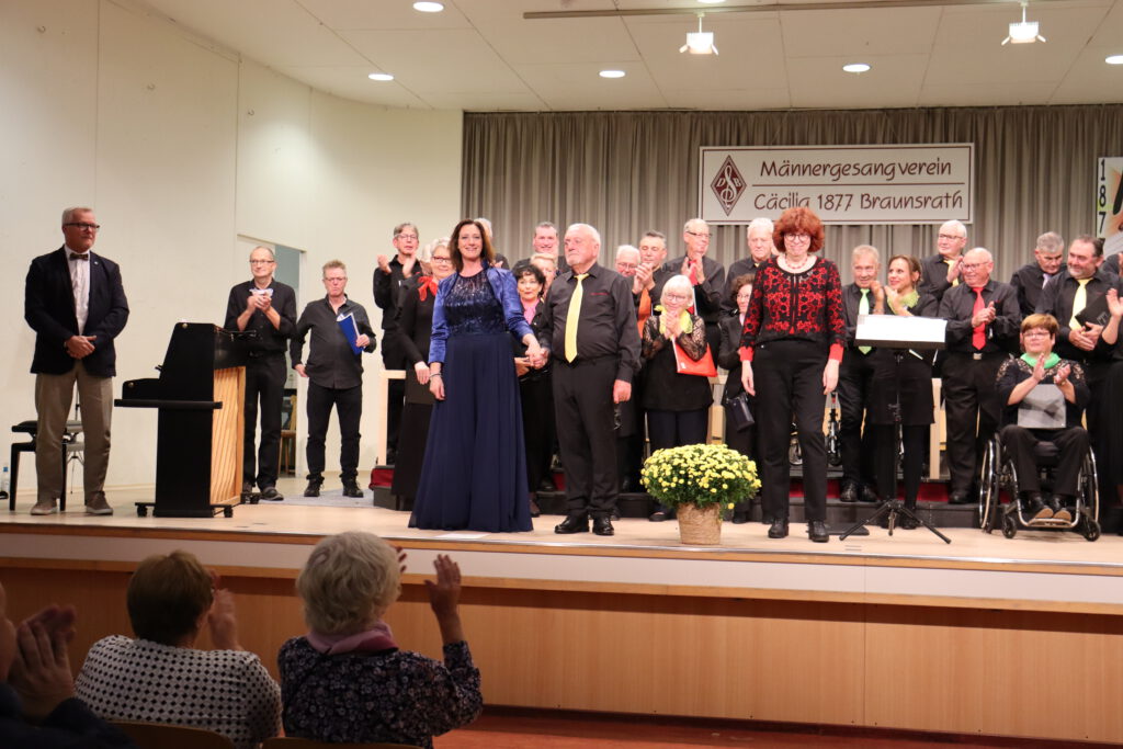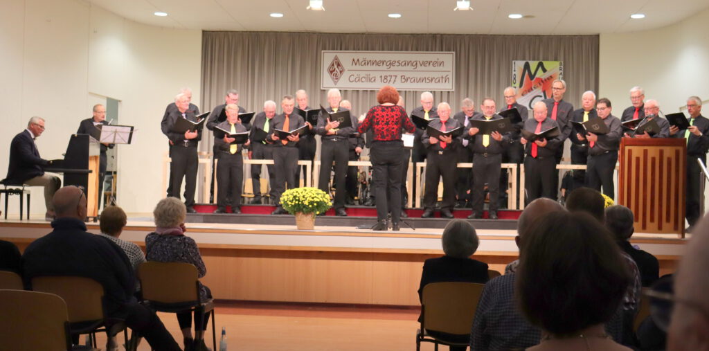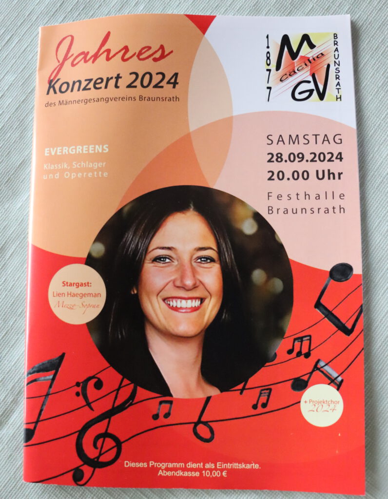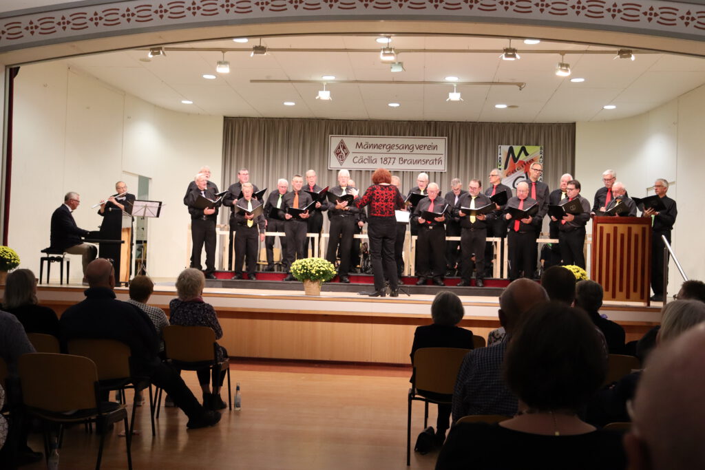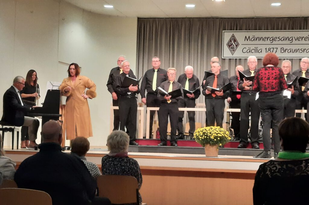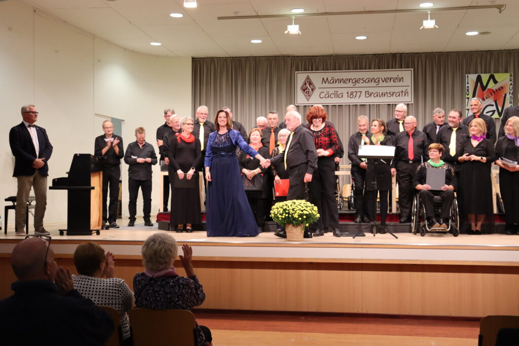 Es war ein Konzert, wie es Tradition hat in Braunsrath – und doch war es auch dieses Mal wieder eines, wofür der Männergesangsverein Cäcilia sich wieder so einiges hatte einfallen lassen. Dazu gehörten nicht die Begrüßung durch den Vorsitzenden Bernd Geldmacher oder die humorvolle Moderation von Franz Grefen, über die sich das Publikum in der gut besetzten Festhalle freute. Neu war die Gesangssolistin Lien Haegeman, die schon im zweiten Lied des Chores für eine Überraschung sorgte, als sie, im Programm gar nicht angekündigt, im gleichnamigen Lied als Lili Marleen auftrat.